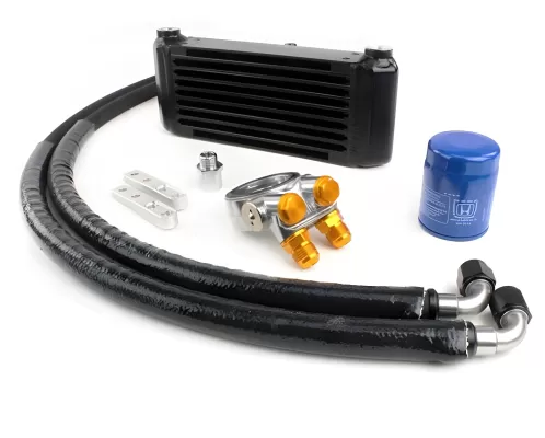 One of the biggest challenges when racing is temperature. Under these heavy loads, the oil temperature can quickly rise and can result in severe damages to the engine if left unchecked. To prevent this, oil coolers are installed to keep those temperatures in a safe and optimal range. But not all oil coolers are built the same. Perrin took steps to provide a robust kit that ensures better temps, but also rugged construction. The kit uses a Setrab core for optimum heat dissipation. The core is fed by Auroquip -10 AN hoses, designed for prolong heat exposure and tight seals. The hoses are wrapped in industrial grade Pyrojacket which can withstand 500 degrees F of continuous heat exposure. Everything is linked to Perrin's own designed oil filter adapter and spacer. This adapter includes a thermostatic switch designed to open at 185 degrees F, which allows the oil to reach proper operating temperature. With custom made Perrin CNC machined brackets and careful attention to detail, makes this one of the most formidable kits on the market.